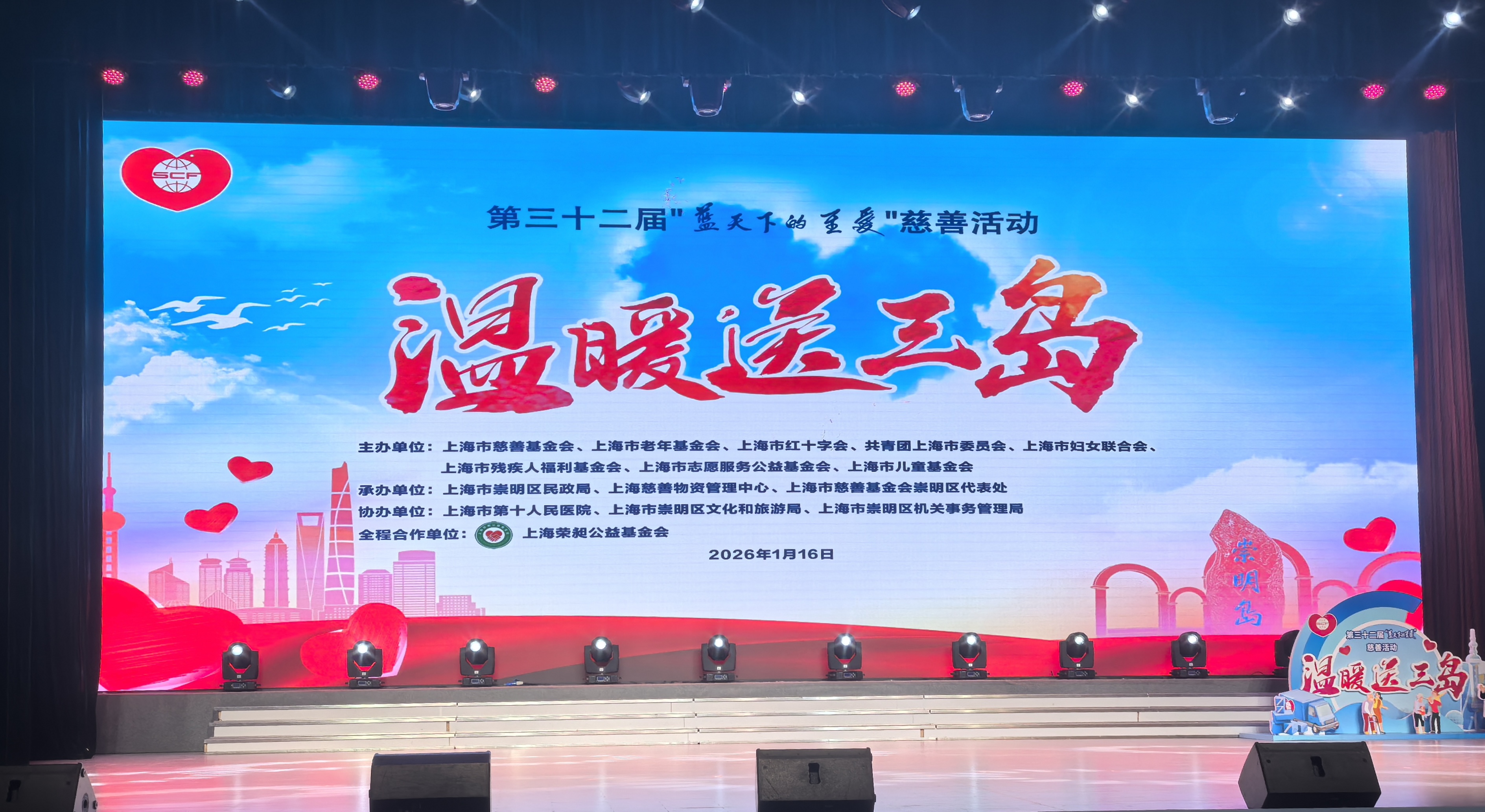 1月16日,第三十二届“蓝天下的至爱”系列慈善活动 ——“温暖送三岛”在崇明区文化馆风瀛洲剧场举行。上海市老年基金会理事长莫负春、副理事长孙萍、朱礼福,崇明区区委副书记、区长吕晨飞,上海市慈善基金会监事长施涛、副理事长丁斐平,各主办单位领导应邀出席,共同见证这份跨越三岛的新春暖意。