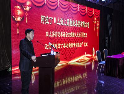 2018年1月5日下午,上海市老年基金会2018年首个专项基金“阿拉丁尊老(爱幼)基金”在美兰湖国际会议中心宣布设立。市老年基金会理事长胡延照出席并讲话。市老年基金会顾问、上海警备区原政委张立志宣读同意设立“阿拉丁尊老(爱幼)基金”的复函。市老年基金会副理事长唐国才与阿拉丁·上海上置物业集团有限公司总裁施建签署有关捐赠协议,唐国才向施建颁发荣誉证书,唐国才、施建共同为“阿拉丁尊老(爱幼)基金”揭牌。市老年基金会副秘书长甘维刚代表市老年基金会接受阿拉丁·上海上置物业集团有限公司捐赠的爱心捐款人民币100万元。