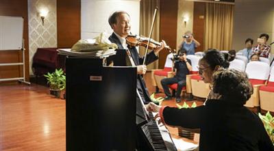 曾以首演《金色的炉台》《千年的铁树开了花》等经典作品而风靡大江南北的著名小提琴演奏家潘寅林,与夫人雷敬蓉在音乐会上琴、弦唱和。他们不仅亮出自己的绝活,还邀请老年钢琴琴友一起登台合演。潘寅林说,“只要老人开心,我愿意配合他们的节奏。”