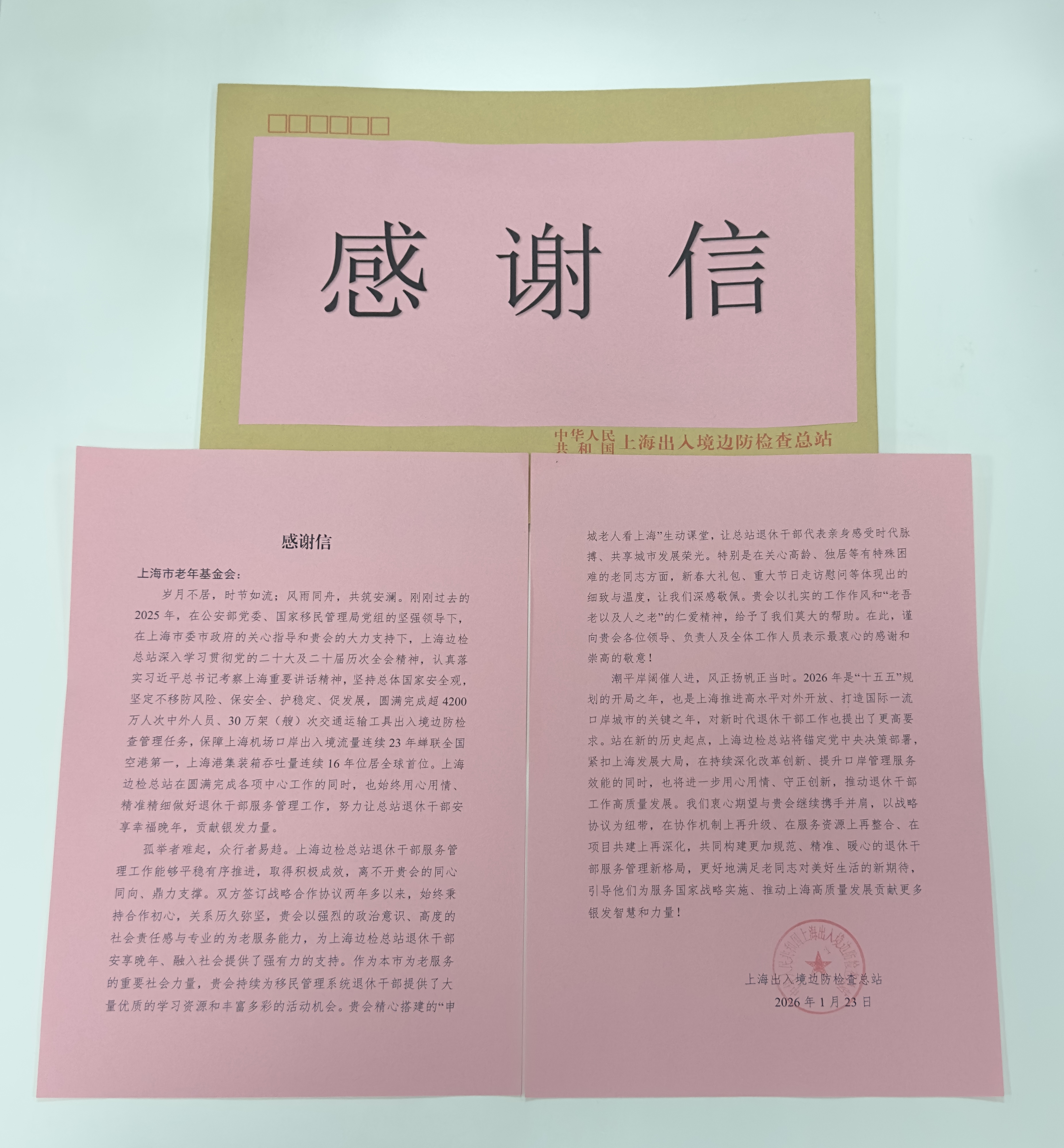 双方自签订战略合作协议两年多以来,始终秉持合作初心,关系历久弥坚。信中写到:“贵会以强烈的政治意识、高度的社会责任感与专业的为老服务能力,为上海边检总站退休干部安享晚年、融入社会提供了强有力的支持。作为本市为老服务的重要社会力量,贵会持续为移民管理系统退休干部提供了大量优质的学习资源和丰富多彩的活动机会。贵会精心搭建的‘申城老人看上海’生动课堂,让总站退休干部代表亲身感受时代脉搏、共享城市发展荣光。特别是在关心高龄、独居等有特殊困难的老同志方面,新春大礼包、重大节日走访慰问等体现出的细致与温度,让我们深感敬佩。贵会以扎实的工作作风和‘老吾老以及人之老’的仁爱精神,给予了我们莫大的帮助。”