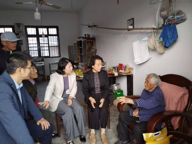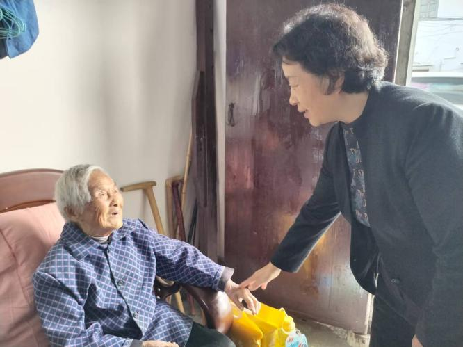 在车墩镇分管副镇长徐春元的陪同下,杨飞云一行首先来到联庄村百岁老人王榴英家中,为老人送上诚挚的节日祝福。杨飞云亲切地俯下身与老人牵手交谈,详细向其子女询问老人的饮食起居与身体状况。当得知老人生活作息规律、饮食均衡,还会主动在屋前场院帮忙摘毛豆、收衣服,始终保持着“被需要”的积极状态时,同行人员纷纷竖起大拇指,既为老人的健康硬朗点赞,也向家属无微不至的照料表示感谢,正是这份关爱让老人的晚年生活既有质量更有温度。