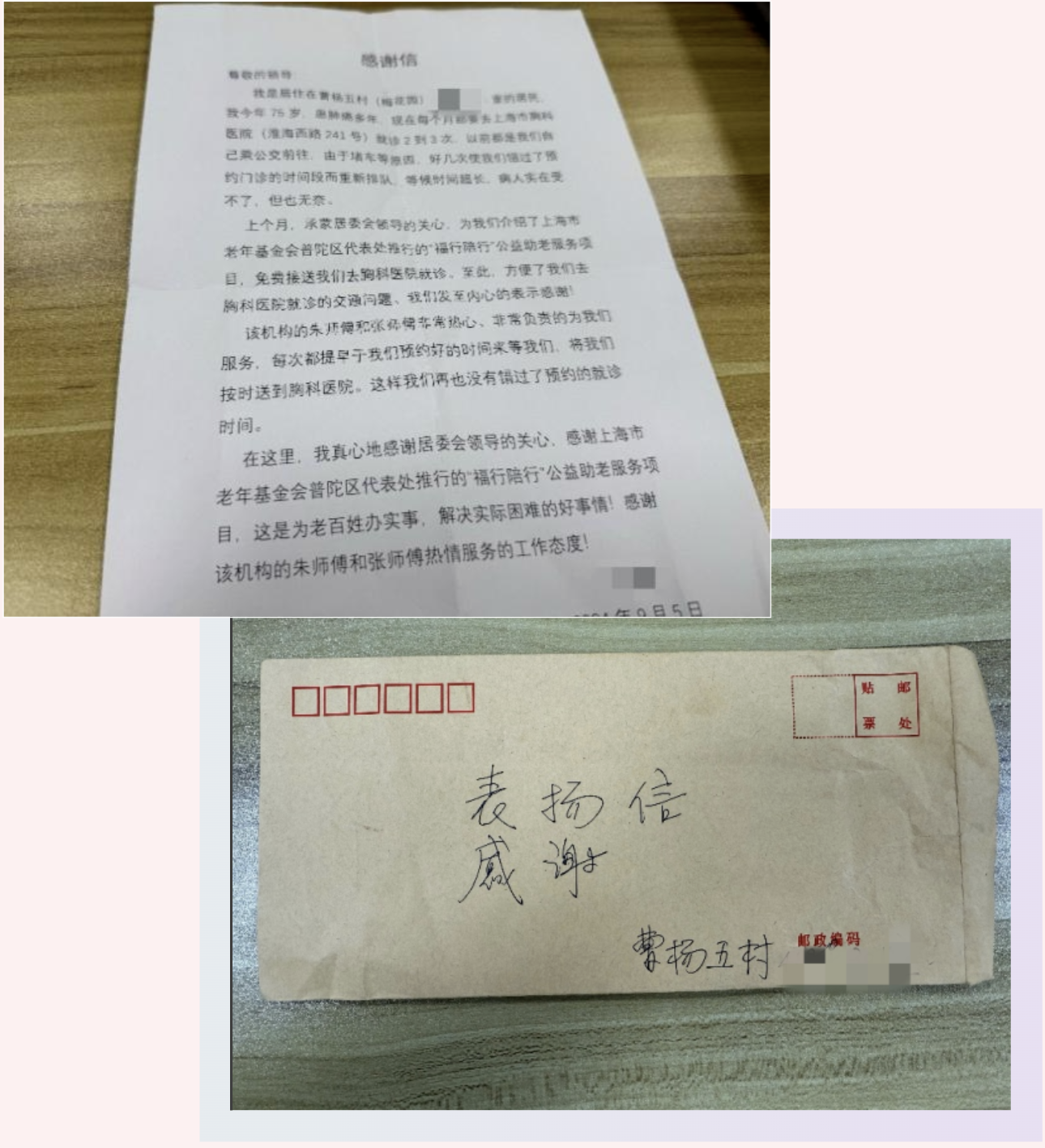同样感受到项目温暖的,还有曹杨新村街道75岁的曹老伯。罹患肺癌多年的他,每月需频繁往返医院,就医之路曾是其生活中的一大难题。在街道居委的协助下,曹老伯被纳入项目服务名单。亲身体验后,他由衷赞叹这是为老百姓办的一件大实事,切实解决了他的实际困难,并送来情真意切的感谢信,字里行间洋溢着“老有所依、老有所养”的踏实与温暖。