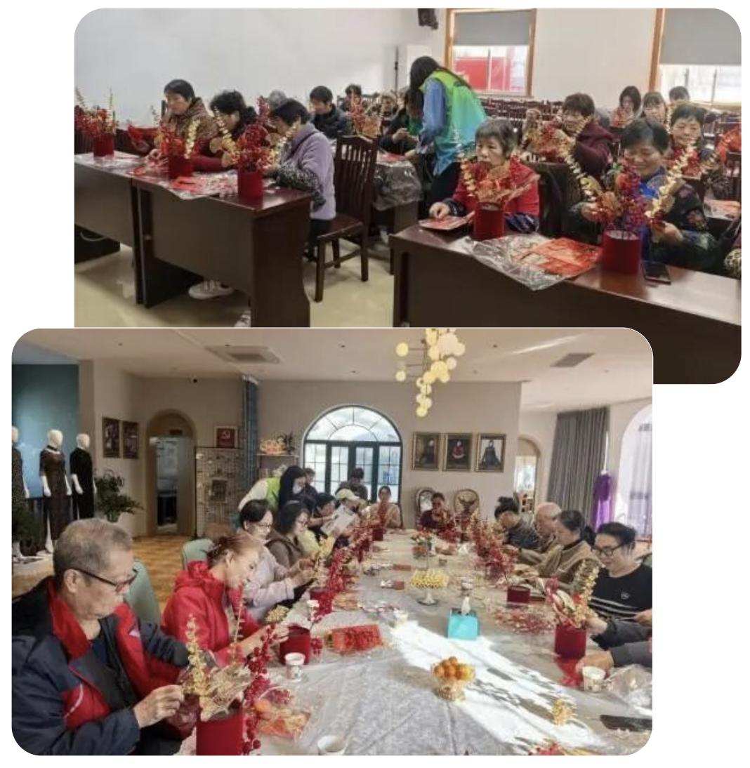 志愿者提前备齐年花、抱抱桶、工具等材料,营造温馨环境。专业老师通过演示讲解制作要点,从花材介绍到造型固定逐一指导。老人们学习热情高涨,主动请教问题,现场互动频繁、氛围热烈。