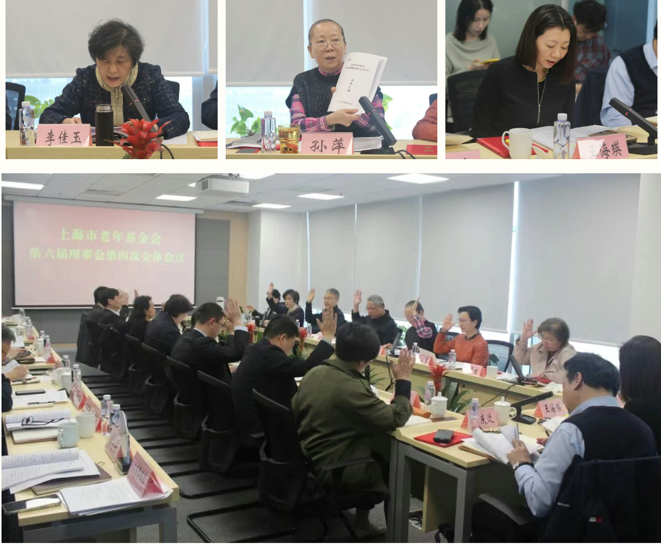 4月8日,上海市老年基金会召开第六届理事会第四次全体会议。理事长莫负春出席并主持会议,副理事长孙萍、朱礼福、何以琴、李佳玉、朱晨红、章淑萍和理事会成员参加会议;监事长王海瑛及监事会成员、部分区代表处会长应邀列席会议。