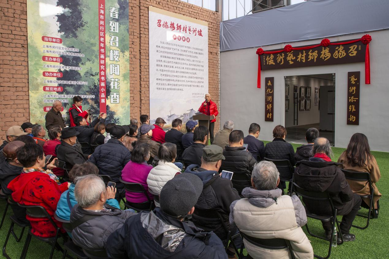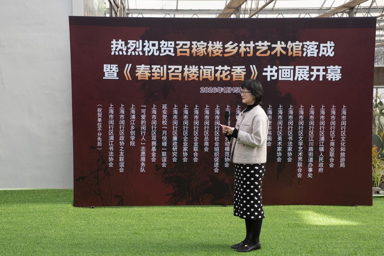 1月15日上午,召稼楼乡村艺术馆落成暨《春到召楼闻花香》书画展开幕仪式在召稼楼古镇隆重举行。本次书画展由上海市老年基金会闵行区代表处资助。闵行区原政协主席吴申耀、区委宣传部副部长许新江、江川路街道办事处副主任张磊、浦江镇党委宣传委员娄妤等领导、艺术家代表及社会各界人士等齐聚古镇,共同见证这一文化盛事。