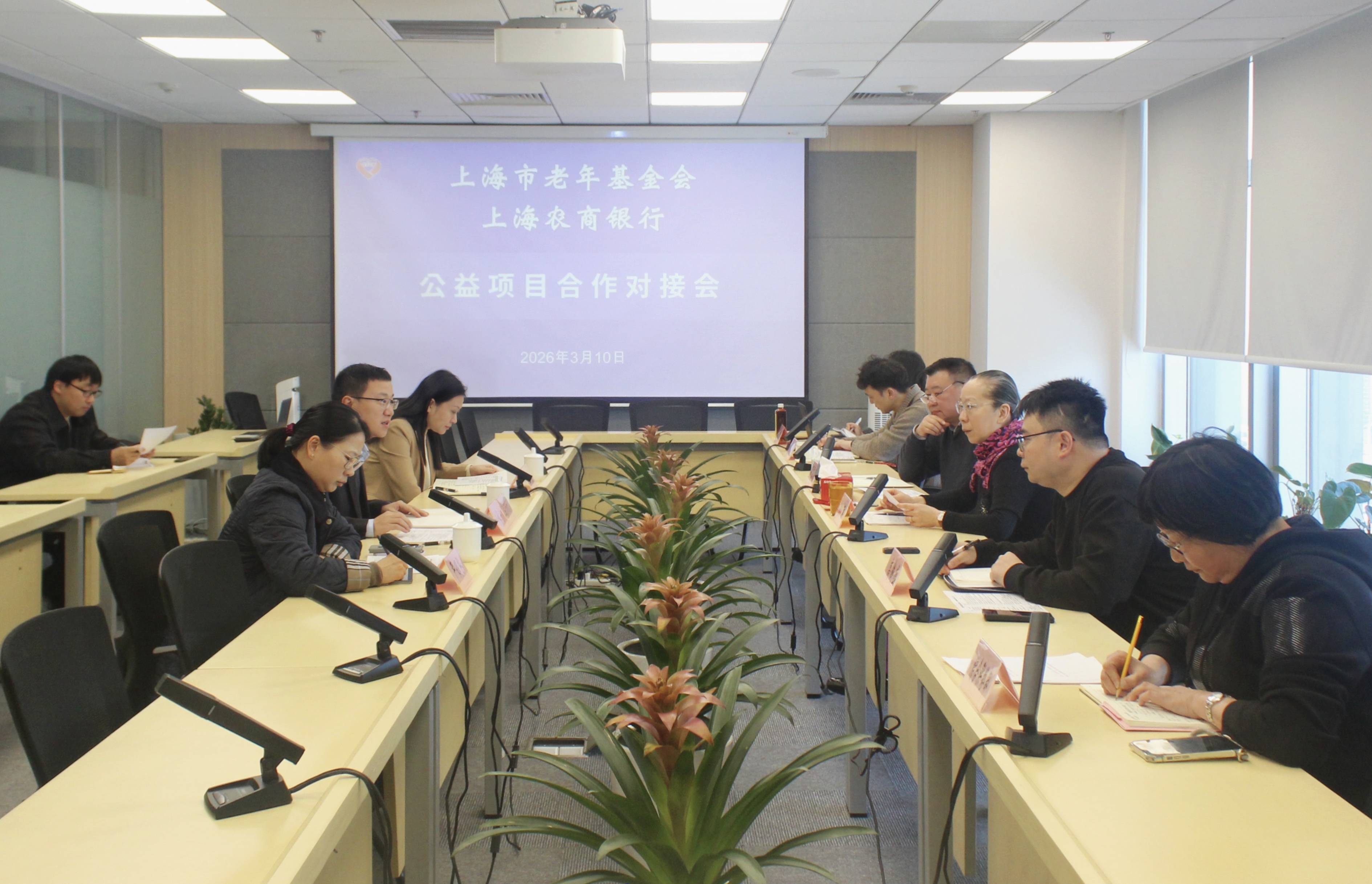 3月10日,上海市老年基金会与上海农村商业银行股份有限公司召开公益项目合作对接会,就项目安排进行深入研讨。市老年基金会副理事长孙萍,理事高钱盛,办公室主任顾恩明;上海农商银行总行营业部总经理杨祯宁,总行基础客群部总经理王兰,总行基础客群部副总经理严超弘,以及市会办公室相关人员参加会议。孙萍主持会议。