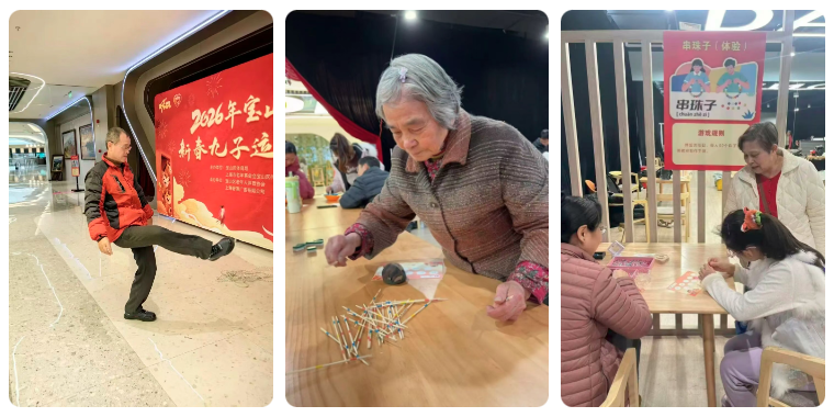 丙午新春,上海海上世界洋溢着别样年味。由上海市老年基金会宝山区代表处与区体育局联合主办的“新春九子运动会”在此温情启幕。活动以海派经典弄堂游戏为载体,将滚圈子、打弹子、抽陀子等传统“九子”项目精彩呈现,营造出浓厚的节日体育氛围,生动诠释了文化助老、体育惠老的特色理念。