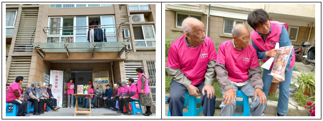 理发和量血压活动结束后,志愿者们还向老人们宣传“敬老月”的活动海报、宣传口号等。