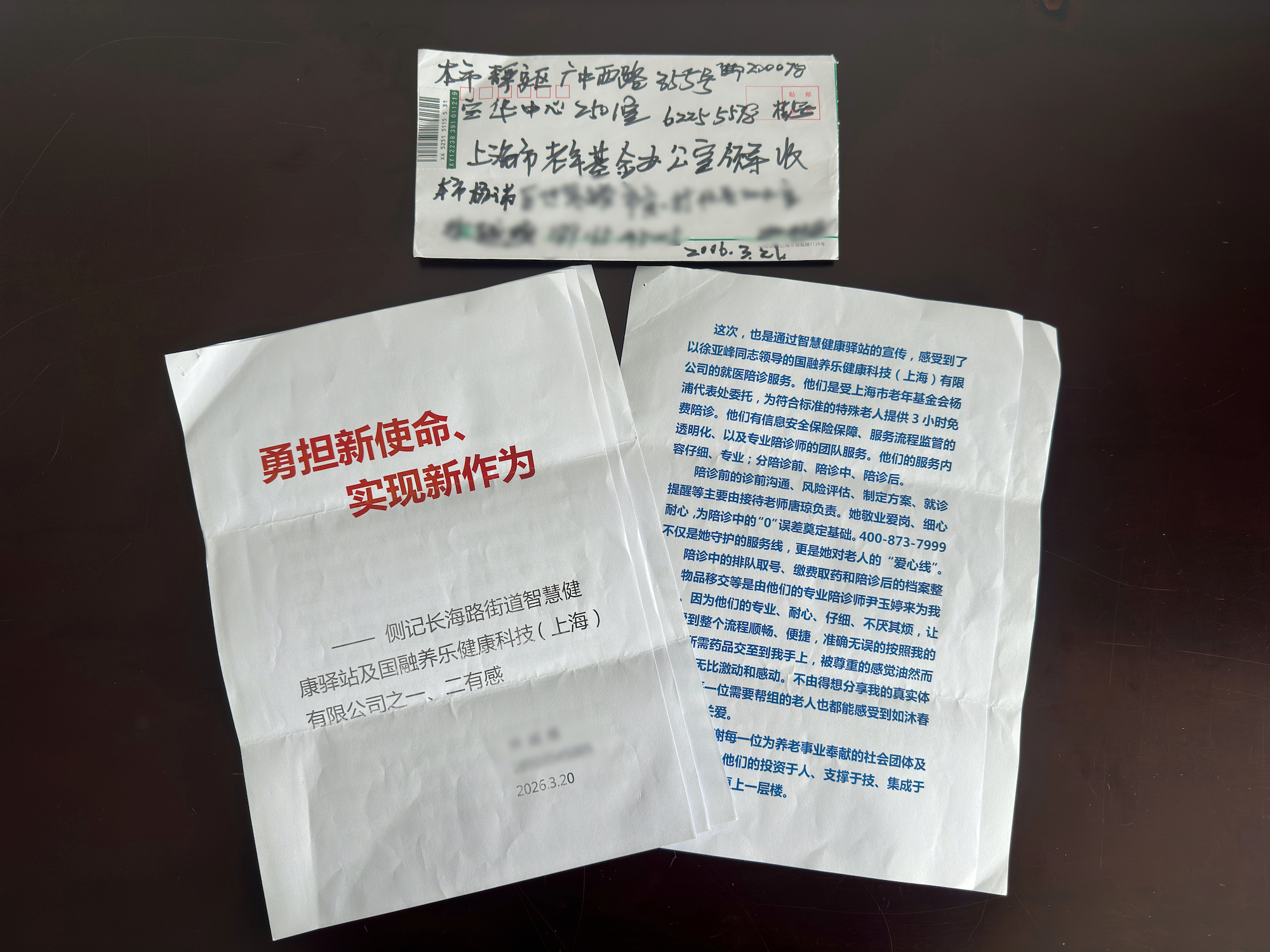 2026年是我国“十五五”开局之年,面对人口老龄化“规模大、速度快、程度深”的态势,上海正以精细化服务构建多层次养老服务体系,让银发群体的获得感、幸福感、安全感持续提升。近日,88岁残疾老人林老伯写下感谢信,为长海路街道智慧健康驿站及国融乐养健康科技(上海)有限公司的暖心服务点赞。