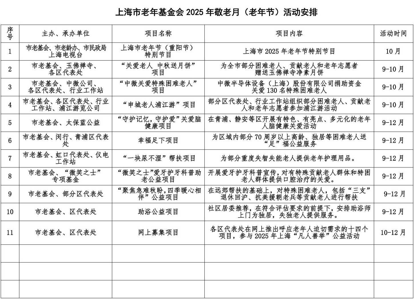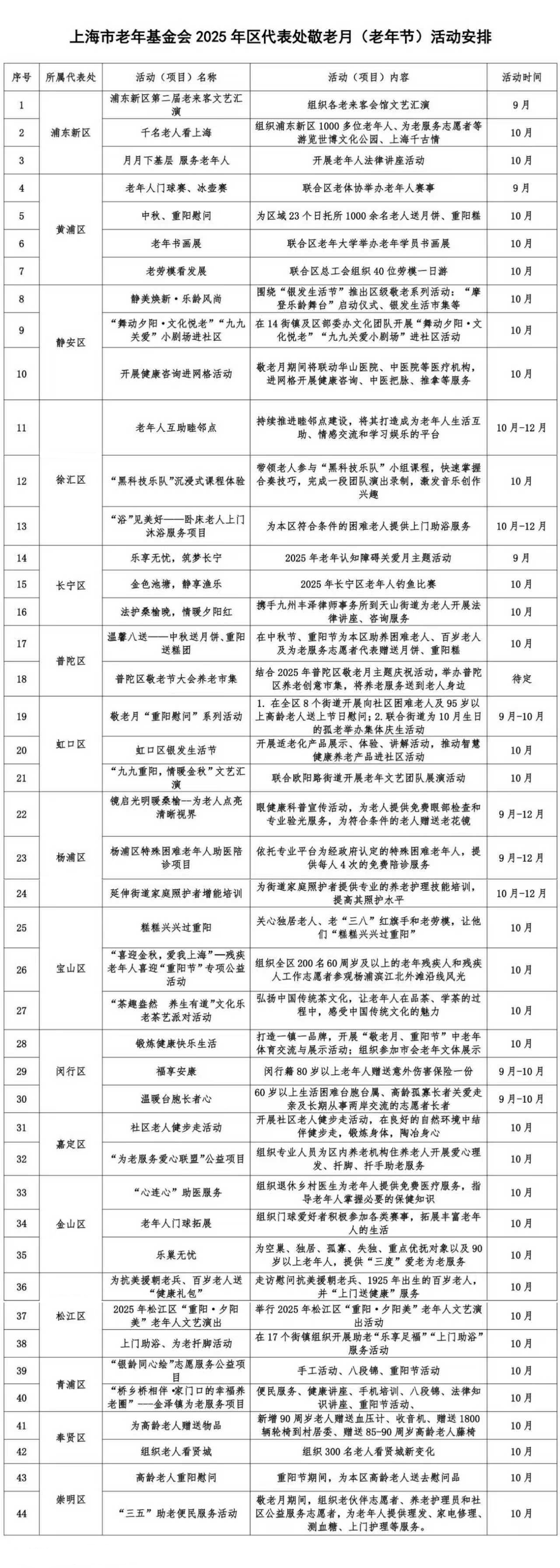 2025年10月是以“弘扬孝亲敬老美德 共建老年友好社会”为主题的第16个全国敬老月,10月11日是上海市第38个敬老日。在敬老月期间将广泛开展形式多样、内容丰富的敬老爱老助老活动,大力弘扬孝亲敬老传统美德,加强对老年人关爱帮扶,扎实推进老年友好型社会建设,切实把老年人生活保障好、作用发挥好、权益维护好。现推出市会、各区代表处敬老月期间的部分活动,希望大家广泛宣传,让广大老年人可感、可知、可及,得到实实在在的实惠,切实增强老年人的获得感、幸福感、安全感。