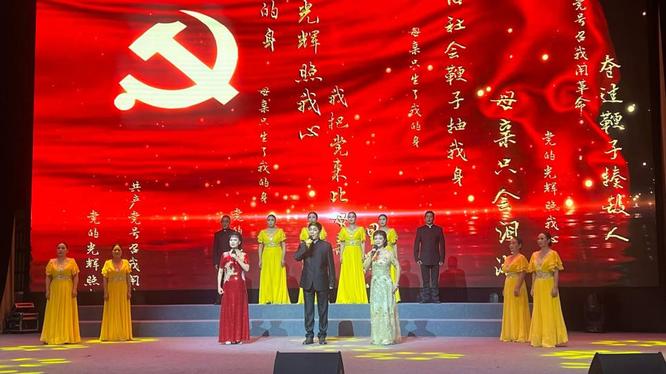 当演出接近尾声,松江退役军人艺术团奉献两首经典曲目——《弹起我心爱的土琵琶》婉转忆往昔,《强军战歌》铿锵振人心,激昂歌声里满是赤诚,让全场热情持续升温。最后,两位主持人走上舞台,请全体人员起身,共同齐唱《没有共产党就没有新中国》,熟悉的歌声在剧场内盘旋回荡,将现场的感动与振奋推向顶点。