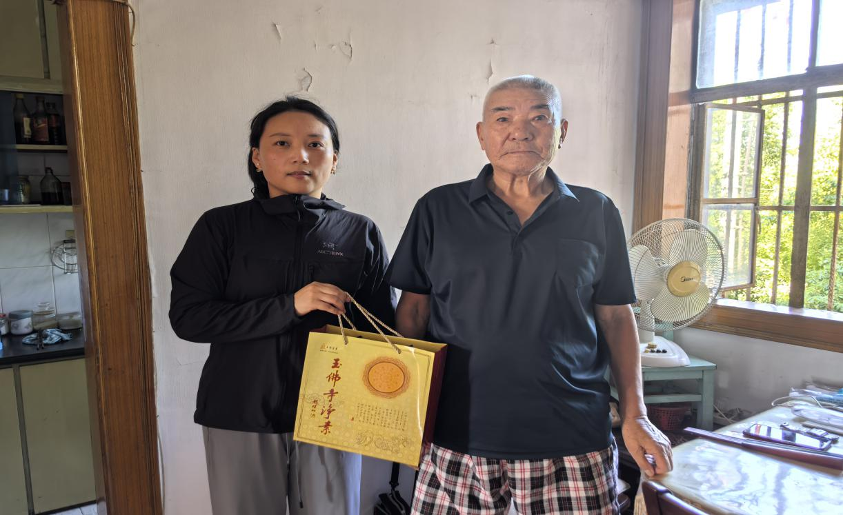 88岁的尹丽琴是一位抗美援朝的女战士,也是一位高龄独居老人。社区志愿者赵丽萍上门为她转送“玉佛禅寺”的月饼,提前祝福老人“国庆节”、“中秋节”快乐!老人因参加抗美援朝,留下了耳疾,听力不佳,工作人员热切地关心老人的身体及生活状况,叮嘱她保重好身体,过好幸福的晚年生活!尹丽琴老人表示:党和政府及社会各界一直关心、关爱着我们这些特殊老人,在这和平幸福的年代我们要过好每一天!