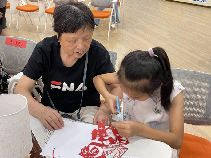 手工环节启动后,现场瞬间变成充满匠心的 “秋日剪纸工坊”。“社区小先生” 们捧着材料包,主动凑到爷爷奶奶身边,有的踮着脚举着剪刀请教:“爷爷,您看这个弧度怎么剪才圆呀?” 有的捧着红纸撒娇:“奶奶,您小时候是不是也剪过这样的纸花?” 老人们看着熟悉的图案,眼神瞬间亮了。