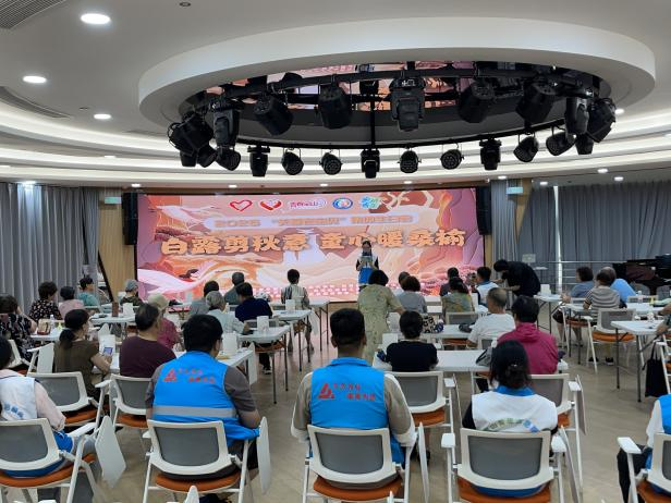 最后,志愿者傅文昊带来歌曲《风华正茂》,青春的嗓音里满是对生活的热爱与对未来的期许,台下的老人们轻轻跟着哼唱,手中的 “露华灯” 在灯光下微微晃动,剪纸的纹样与歌声的暖意交织,成了生日宴上最动人的风景。台下不少老人边听边轻轻抚摸手中的 “露华灯”,剪纸的温度与歌声的暖意,在空气中交织成最动人的旋律。
