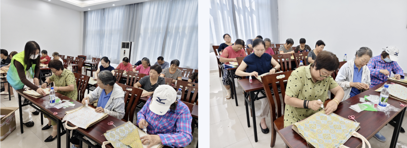 随后,指导老师分步讲解宋锦包制作方法与操作要点,老人们动手体验,经过近二个小时的专注制作,一个个兼具非遗韵味与个人巧思的宋锦包陆续完成——有的老人在包身正面用珍珠围绕宋锦花纹摆出多种形状,有的则沿包口边缘点缀珍珠,简约又雅致。老人们纷纷拿起自己的作品相互展示,脸上满是成就感,现场洋溢着欢乐温馨的氛围。